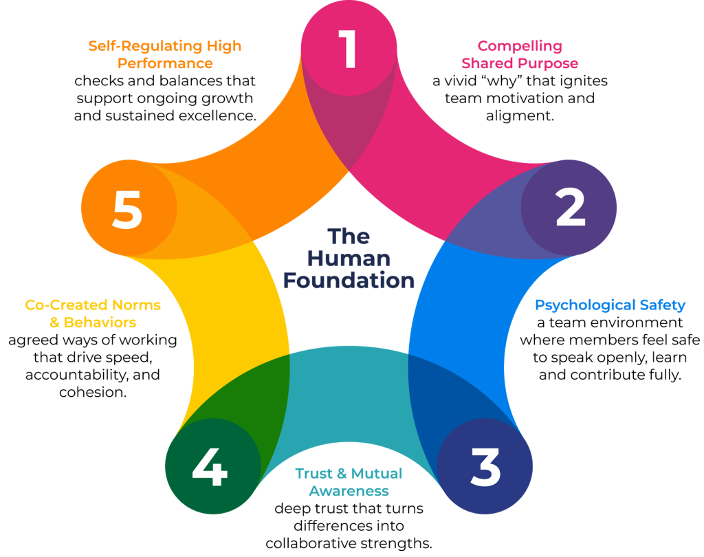 We cultivate five interconnected team realities that enable people to grow and turn collective potential into a self-sustaining engine for execution and wellbeing: